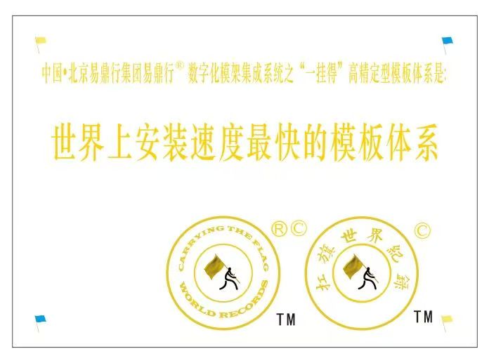 世界紀錄保持者: 中國•北京易鼎行集團易鼎行®數(shù)字化模架集成系統(tǒng)之“一掛得”高精定型模板體系。